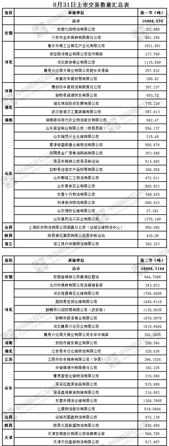 8月31日兩節(jié)共計輪出儲備棉30003.2894噸。第一節(jié)銷售儲備棉15004.574噸,其中需要倒垛出庫87捆。第二節(jié)銷售儲備棉14998.7154噸,其中需要倒垛出庫61捆。