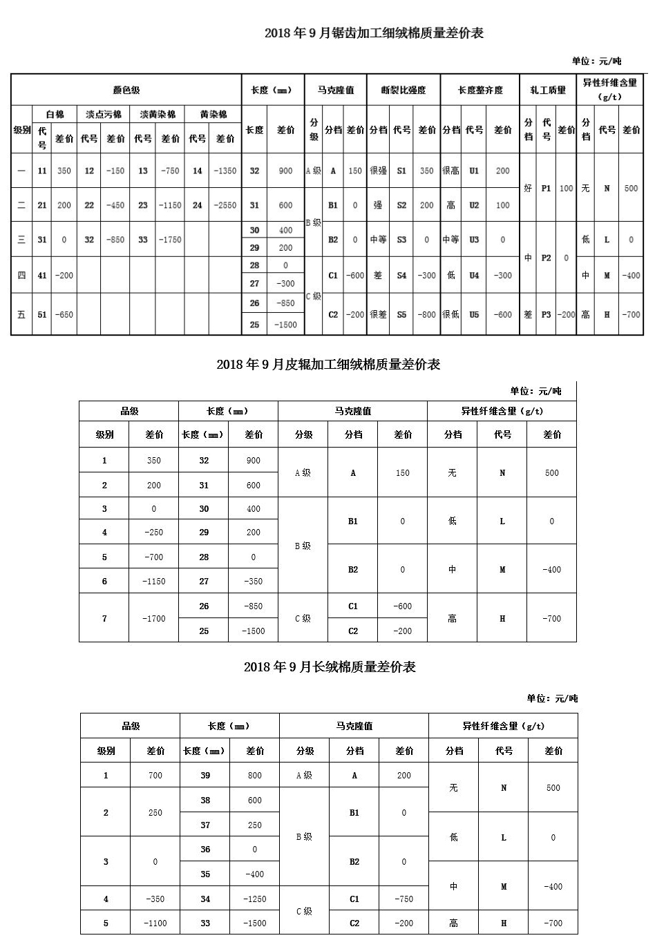 根據(jù)《中國棉花協(xié)會國產(chǎn)棉質(zhì)量差價表管理辦法》規(guī)定,現(xiàn)正式發(fā)布2018年9月《鋸齒加工細(xì)絨棉質(zhì)量差價表》、《皮輥加工細(xì)絨棉質(zhì)量差價表》和《長絨棉質(zhì)量差價表》(單位:元/噸)。