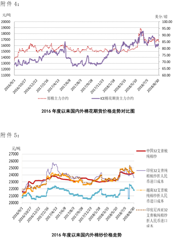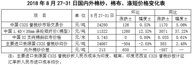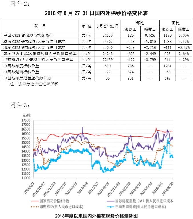 附件2:2018年8月27-31日國(guó)內(nèi)外棉紗價(jià)格變化表