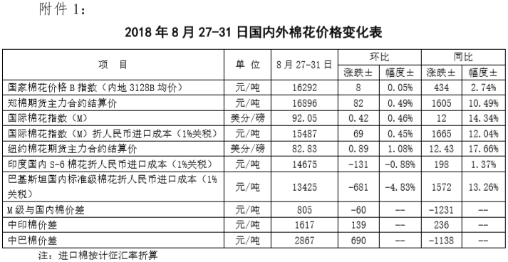 附件1:2018年8月27-31日國(guó)內(nèi)外棉花價(jià)格變化表