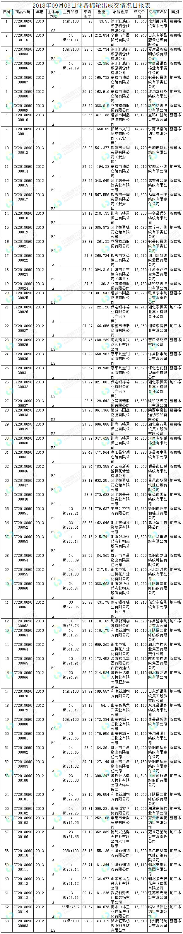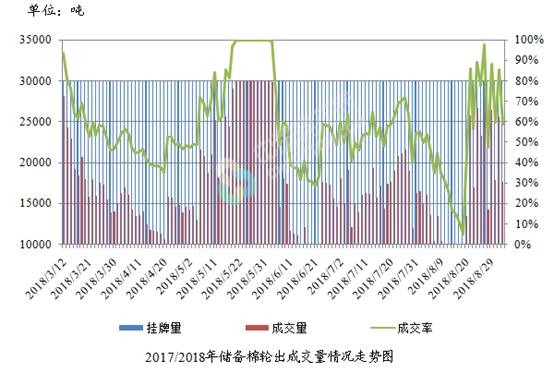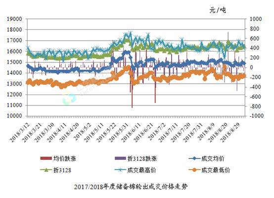 9月3日儲備棉輪出銷售資源30004.0121噸,實際成交17678.7502噸,成交率58.92%。平均成交價格14898元/噸(較前一日下跌70元/噸);折3128價格16442元/噸(較前一日上漲44元/噸)。