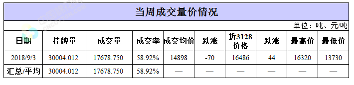 累計情況:截至9月3日,累計計劃出庫369.1萬噸,累計出庫成交213.5萬噸,成交率為58%;成交最高價17700元/噸,最低價12700元/噸。