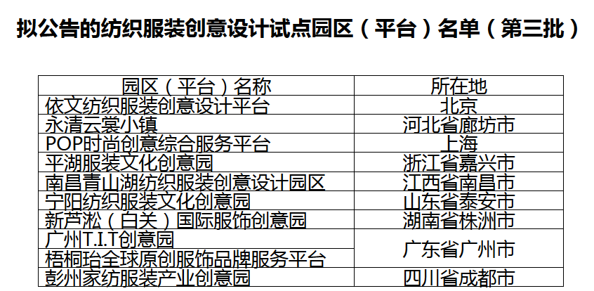 工信部消費品工業(yè)司發(fā)布通知稱,據(jù)《工業(yè)和信息化部關(guān)于印發(fā)<紡織服裝創(chuàng)意設(shè)計試點示范園區(qū)(平臺)管理辦法(試行)>的通知》和《工業(yè)和信息化部辦公廳關(guān)于開展2018年紡織服裝創(chuàng)意設(shè)計試點園區(qū)(平臺)創(chuàng)建工作的通知》有關(guān)要求,經(jīng)園區(qū)(平臺)自愿申報、省級工業(yè)和信息化主管部門推薦、專家論證,現(xiàn)將擬公告的紡織服裝創(chuàng)意設(shè)計試點園區(qū)(平臺)名單(第三批)予以公示。
