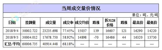 累計情況:截至9月4日,累計計劃出庫372.1萬噸,累計出庫成交215.8萬噸,成交率為58%;成交最高價17700元/噸,最低價12700元/噸。