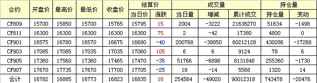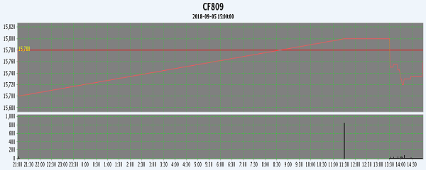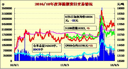 9月5日隔夜鄭棉回升,今日早盤橫向震蕩,午后回落,尾盤反彈,日線形成小陽線。日內(nèi)成交量變化不大,持倉量減少?;久媲闆r:據(jù)冀魯?shù)貐^(qū)紡企反饋,近期純棉紗價格整體上漲。截止9月4日,山東某廠普梳21S、32S、40S價格分別為21800元/噸、24300元/噸、25300元/噸,價格較8月31日分別上漲50元/噸、50元/噸、100元/噸。目前企業(yè)滿負(fù)荷生產(chǎn),訂單狀況尚可。另外,精梳紗價格漲幅略好于普梳紗。與此同時,低支紗價格漲幅較小。截止9月4日,河北地區(qū)氣流紡OE10S價格在14600元/噸一線,廠商表示,近期訂單變化不大,價格維持穩(wěn)定。