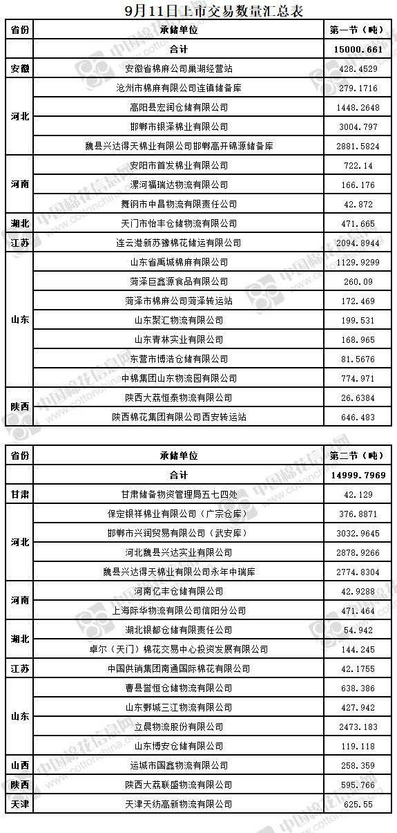 4、東營市博浩倉儲有限公司(含部分包檢)、高陽縣宏潤倉儲有限公司(含部分包檢)、邯鄲市銀澤棉業(yè)有限公司、連云港新蘇豫棉花儲運有限公司、漯河福瑞達(dá)物流有限公司、山東省禹城棉麻有限公司、安徽省棉麻公司巢湖經(jīng)營站、魏縣興達(dá)得天棉業(yè)有限公司邯鄲高開錦源儲備庫為實施按批抽樣方式檢驗的承儲庫,由于掛牌較為集中,請買方妥善協(xié)商安排出庫。