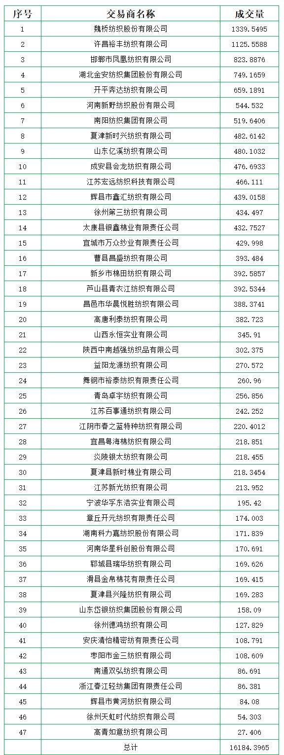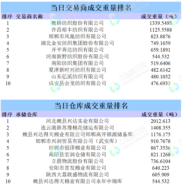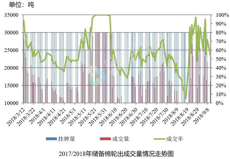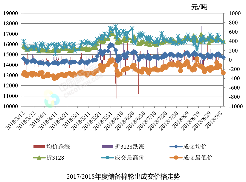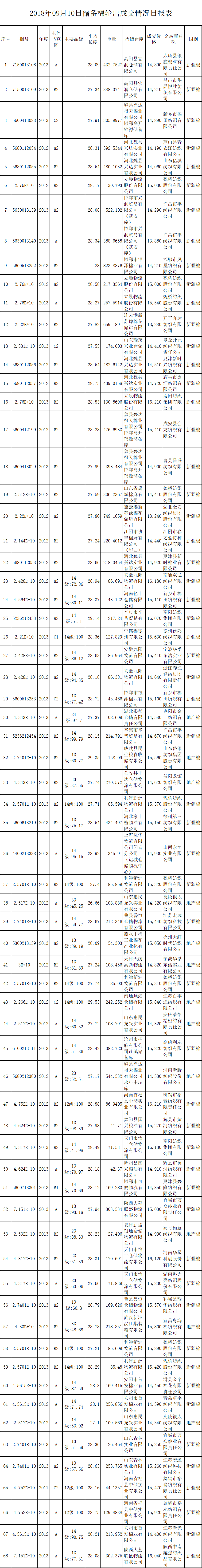 9月10日儲備棉輪出銷售資源30000.4175噸,實際成交16184.3965噸,成交率53.95%。平均成交價格14748元/噸(較前一日下跌147元/噸);折3128價格16304元/噸(較前一日下跌113元/噸)。