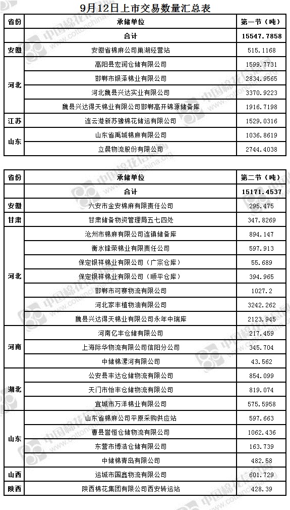 4、安徽省棉麻公司巢湖經(jīng)營站、河北魏縣興達(dá)實(shí)業(yè)有限公司、山東省禹城棉麻有限公司、魏縣興達(dá)得天棉業(yè)有限公司邯鄲高開錦源儲備庫、連云港新蘇豫棉花儲運(yùn)有限公司、邯鄲市銀澤棉業(yè)有限公司、高陽縣宏潤倉儲有限公司、立晨物流股份有限公司為實(shí)施按批抽樣方式檢驗(yàn)的承儲庫,由于掛牌較為集中,請買方妥善協(xié)商安排出庫。
