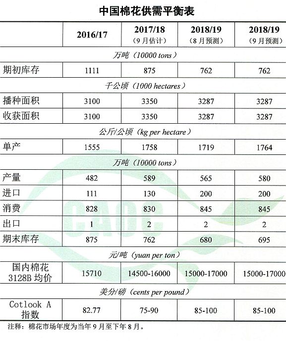 棉花:本月預測,2018/19年度,中國棉花播種面積約3287千公頃,維持上月估計值不變;8月主要棉區(qū)熱量條件充足,棉花長勢良好,一、二類苗比例較上年略高,自然災害輕度發(fā)生,棉花單產調增至每公頃1764公斤,比上年度增加0.3%;棉花產量580萬噸,較上月調增15萬噸,比上年度減少1.6%。紡織品服裝出口形勢尚好,預計棉花消費量為845萬噸,維持上月估計值不變。期末庫存695萬噸,比上月調增15萬噸。