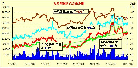 13日紐約期棉市場全面收跌。1812合約結(jié)算價(jià)81.51美分,跌113點(diǎn);1903合約結(jié)算價(jià)81.97美分,跌106點(diǎn);1905合約結(jié)算價(jià)82.44美分,跌92點(diǎn)。其他合約下跌1-74點(diǎn)不等。當(dāng)日12月合約小幅低開,開盤后交易重心受支撐上行,至當(dāng)日高點(diǎn)82.64美分處賣盤入場,市場承壓走低,低點(diǎn)處買盤發(fā)力,交易重心受支撐上行,但因上漲動(dòng)力不足,迅速回落,最終以跌勢收盤。隨著颶風(fēng)Florence在卡羅萊納登陸,將帶來大風(fēng)和強(qiáng)降雨天氣。由于東南棉區(qū)大部已進(jìn)入吐絮期,市場普遍關(guān)注其將對棉區(qū)造成何種程度的影響。據(jù)美國農(nóng)業(yè)部(USDA),8.31-9.6日一周美國凈簽約出口2018/19年度陸地棉18552噸(含新簽約19527噸,另取消975噸前期訂單),較前一周減少11%,較近4周平均減少36%;裝運(yùn)2018/19年度陸地棉30776噸,較前一周減少24%,較近4周平均減少27%。凈簽約本年度皮馬棉1315噸;裝運(yùn)皮馬棉635噸。凈簽約出口2019/20年度陸地棉4014噸。外圍美元指數(shù)下跌,玉米、小麥和大豆期貨下跌。美股全線收漲,納指收復(fù)8000點(diǎn)。
