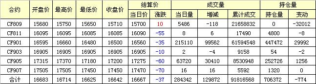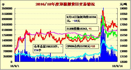 9月14日隔夜鄭棉探低反抽,今日早盤在空頭賣盤打壓下走低,尾盤寬幅震蕩后回落,日線形成小陰線。日內(nèi)成交量放大,持倉量增加。基本面情況:新疆部分地區(qū)籽棉收購價格并沒有降溫的趨勢,奎屯2129級40衣分手摘棉籽棉收購價7.4-7.5元/公斤左右,巴楚縣2128級40衣分手摘棉籽棉收購價7.3元/公斤,托克遜縣2129級36衣分手摘棉籽棉收購價約7.1元/公斤,岳普湖縣3129級40衣分手摘棉籽棉收購價約7.4元/公斤。