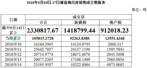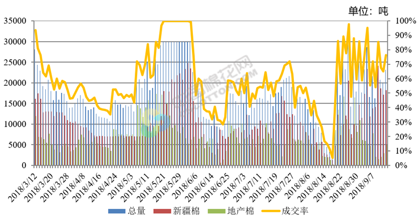 上周(2018年9月10日-14日),2017/2018年度儲(chǔ)備棉輪出第二十七周,中國(guó)儲(chǔ)備棉管理有限公司上市交易儲(chǔ)備棉15.2萬(wàn)噸,其中新疆棉10.5萬(wàn)噸,地產(chǎn)棉4.7萬(wàn)噸;實(shí)際成交10.6萬(wàn)噸,成交率70%,新疆棉成交9.2萬(wàn)噸,成交率88%,地產(chǎn)棉成交1.4萬(wàn)噸,成交率29%。