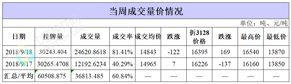 累計(jì)情況:截至9月18日,累計(jì)計(jì)劃出庫402.3萬噸,累計(jì)出庫成交236.8萬噸,成交率為59%;成交最高價(jià)17700元/噸,最低價(jià)12700元/噸。