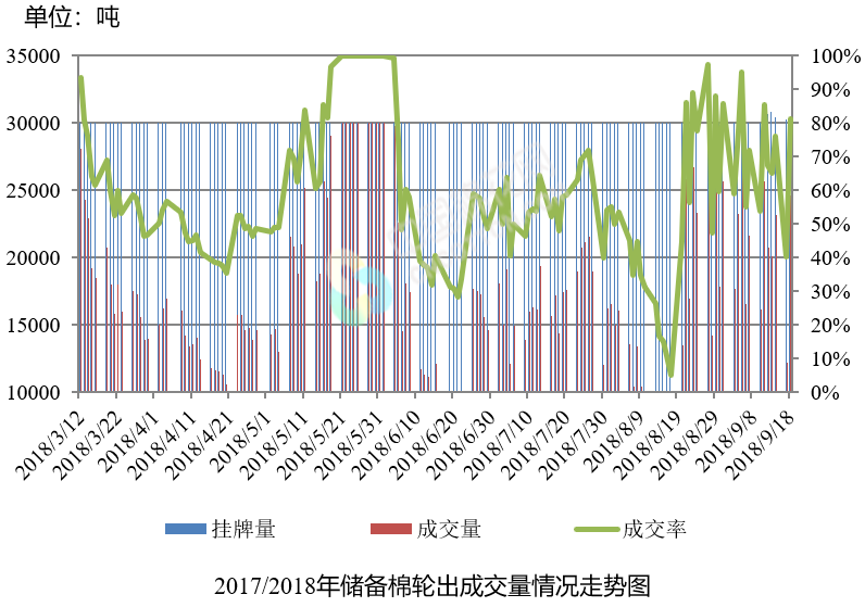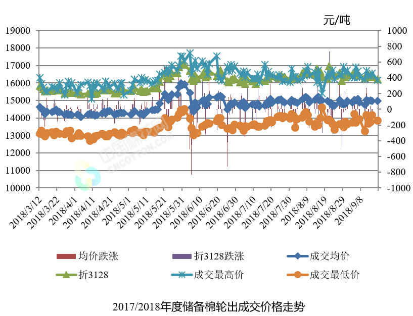 9月18日儲(chǔ)備棉輪出銷售資源30243.404噸,實(shí)際成交24620.8618噸,成交率81.41%。平均成交價(jià)格14843元/噸(較前一日下跌122元/噸);折3128價(jià)格16395元/噸(較前一日上漲169元/噸)。