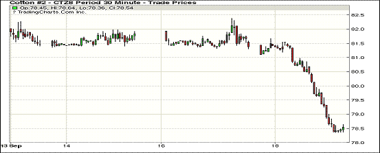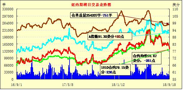 18日紐約期棉市場(chǎng)全面大幅收跌。1812合約結(jié)算價(jià)78.52美分,跌279點(diǎn);1903合約結(jié)算價(jià)79.13美分,跌251點(diǎn);1905合約結(jié)算價(jià)79.89美分,跌231點(diǎn)。其他合約下跌100-216點(diǎn)不等。當(dāng)日12月合約小幅高開,整日交易呈下行態(tài)勢(shì)。開盤后圍繞81.50美分一線窄幅震蕩運(yùn)行,后賣盤入場(chǎng),市場(chǎng)承壓走低,后短暫維持在81.50-81.00美分區(qū)間,因缺乏有利支撐,后跌幅加深,最終以大幅下跌收盤。為自4月24日以來(lái)12月合約最低點(diǎn)。美國(guó)政府宣布將對(duì)2000億美元中國(guó)商品加征關(guān)稅,于9月24日正式開始實(shí)施加征10%,于2019年1月1日起開始加征25%。中美貿(mào)易爭(zhēng)端愈演愈烈的態(tài)勢(shì)引發(fā)市場(chǎng)擔(dān)憂,基金減持多單。外圍美元指數(shù)上漲,小麥期貨上漲,玉米和大豆期貨下跌。美股收盤普漲,標(biāo)普接近新高。
