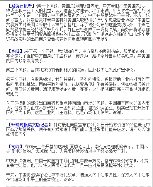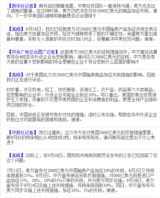 中國(guó)商務(wù)部新聞發(fā)言人高峰20日稱,美國(guó)對(duì)2000億美元中國(guó)商品加征關(guān)稅措施涉及機(jī)電、輕工、紡織服裝、藥品等六大品類,在受影響企業(yè)中,外企占比50%。美方此舉傷害的不僅是中美兩國(guó)企業(yè)和消費(fèi)者利益,還傷害全球產(chǎn)業(yè)鏈安全。目前中國(guó)正在研究有針對(duì)性的措施幫助企業(yè)應(yīng)對(duì)可能的困難。