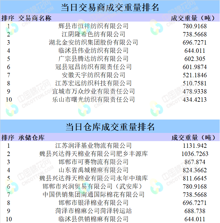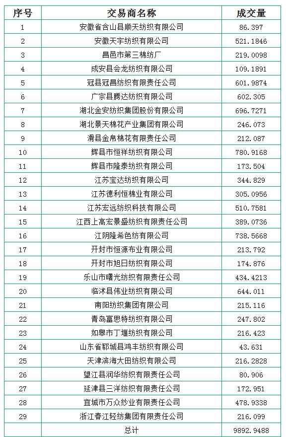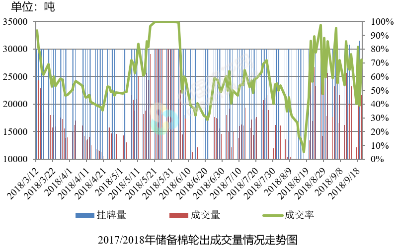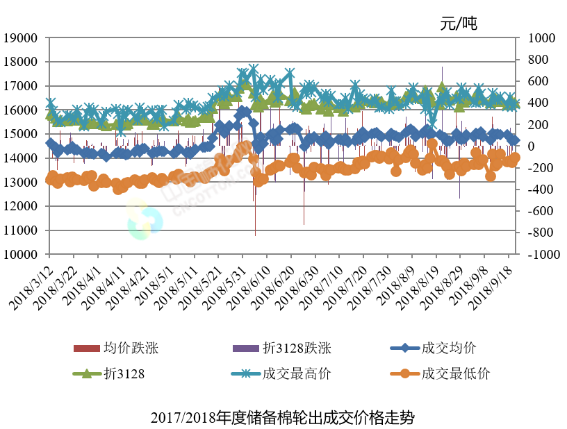 9月21日儲備棉輪出銷售資源30476.584噸,實際成交9892.9488噸,成交率32.46%。平均成交價格14511元/噸(較前一日下跌231元/噸);折3128價格16050元/噸(較前一日下跌241元/噸)。