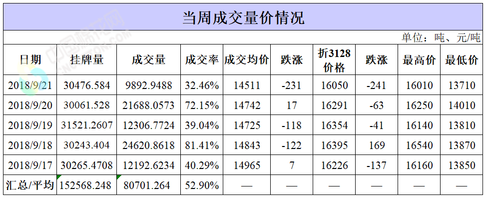 累計情況:截至9月21日,累計計劃出庫411.6萬噸,累計出庫成交241.2萬噸,成交率為59%;成交最高價17700元/噸,最低價12700元/噸。