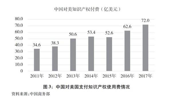 中國對美國支付知識產(chǎn)權(quán)使用費持續(xù)增加。據(jù)中國有關(guān)方面統(tǒng)計,美國是中國第一大版權(quán)引進來源國,2012-2016年,中國自美國引進版權(quán)近2.8萬項。中國對美國支付的知識產(chǎn)權(quán)使用費從2011年的34.6億美元增加至2017年的72億美元,6年時間翻了一番(圖3)。其中2017年中國對美支付占中國對外支付知識產(chǎn)權(quán)使用費總額的四分之一。