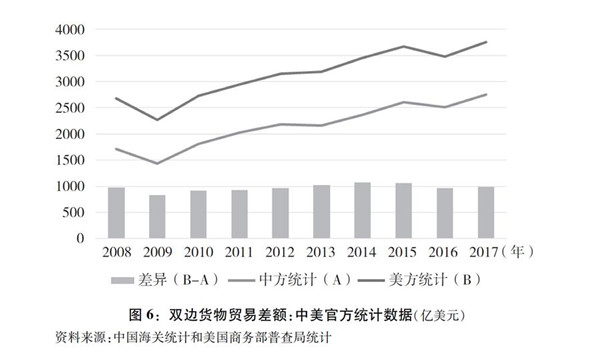 此外,美國統(tǒng)計方法相對高估了中美貨物貿(mào)易逆差額。中美雙方的統(tǒng)計差異長期存在,且差異較大。2017年,中國統(tǒng)計對美貨物貿(mào)易順差為2758億美元,美國統(tǒng)計對華逆差接近3958億美元,相差1000億美元左右。由中美兩國商務(wù)部相關(guān)專家組成的統(tǒng)計工作組,每年就中美貿(mào)易統(tǒng)計差異進行一次比較研究。根據(jù)該工作組測算,美國官方統(tǒng)計的對華貿(mào)易逆差每年都被高估20%左右。根據(jù)中國海關(guān)和美國商務(wù)部普查局的統(tǒng)計,雙方統(tǒng)計結(jié)果在最近十年來的走勢和變動幅度大致相同(圖6)。引起差異的原因包括進口價格和出口價格之間的差異、轉(zhuǎn)口貿(mào)易增值、直接貿(mào)易加價、地理轄區(qū)、運輸時滯等。