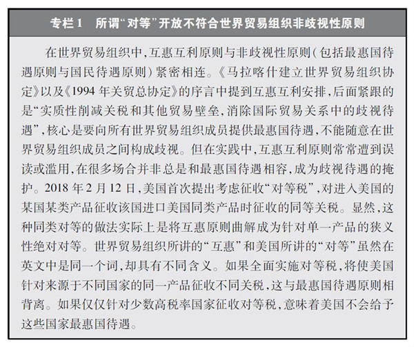 世界貿(mào)易組織所提倡的互惠互利原則,考慮了各國發(fā)展階段的差別。在世界貿(mào)易組織框架下,發(fā)展中成員享有差別和更優(yōu)惠待遇。這種制度安排是在尊重發(fā)展中國家和地區(qū)發(fā)展權(quán)的基礎(chǔ)上,積極吸納新的發(fā)展中成員加入,以擴大成員數(shù)量、增強多邊體制的包容性,也體現(xiàn)了以當期優(yōu)惠換取后期開放的互惠原則。對于發(fā)展中成員而言,由于其處于發(fā)展初期階段,需要對產(chǎn)業(yè)適度保護以促進良性發(fā)展,其市場隨經(jīng)濟發(fā)展擴大后,也將為發(fā)達國家?guī)砀嗌虡I(yè)機會。發(fā)展中成員享有差別和更優(yōu)惠待遇,符合包括發(fā)達成員在內(nèi)的各國各地區(qū)長期利益,這種制度安排是真正意義上的國際公平。2001年,中國通過多邊談判以發(fā)展中成員身份加入世界貿(mào)易組織,享受發(fā)展中成員待遇。十幾年來,中國經(jīng)濟實現(xiàn)了快速發(fā)展,但仍然是一個發(fā)展中國家。由于中國有13.9億人口,經(jīng)濟總量數(shù)據(jù)顯得較為龐大,但這沒有改變?nèi)司l(fā)展水平較低的現(xiàn)實。根據(jù)國際貨幣基金組織數(shù)據(jù),2017年中國人均國內(nèi)生產(chǎn)總值8643美元,僅為美國的14.5%,排在世界第71位。2017年末中國還有3046萬農(nóng)村貧困人口。僅以中國經(jīng)濟和貿(mào)易總規(guī)模較大為依據(jù),要求中國和美國實現(xiàn)關(guān)稅絕對對等是不合理的。美國追求絕對對等的做法,違背了世界貿(mào)易組織最惠國待遇和非歧視性原則(專欄1)。