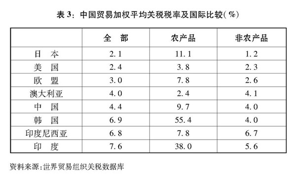 事實上,中國在切實履行加入世界貿(mào)易組織承諾后,還主動通過單邊降稅擴大市場開放。截至2010年,中國貨物降稅承諾全部履行完畢,關(guān)稅總水平由2001年的15.3%降至9.8%。中國并未止步于履行加入世界貿(mào)易組織承諾,而是通過簽訂自由貿(mào)易協(xié)定等方式推進貿(mào)易投資自由化,給予最不發(fā)達國家關(guān)稅特殊優(yōu)惠,多次以暫定稅率方式大幅自主降低進口關(guān)稅水平。根據(jù)世界貿(mào)易組織數(shù)據(jù),2015年中國貿(mào)易加權(quán)平均關(guān)稅稅率已降至4.4%,明顯低于韓國、印度、印度尼西亞等新興經(jīng)濟體和發(fā)展中國家,已接近美國(2.4%)和歐盟(3%)的水平;在農(nóng)產(chǎn)品和制成品方面,中國已分別低于日本農(nóng)產(chǎn)品和澳大利亞非農(nóng)產(chǎn)品的實際關(guān)稅水平(表3)。2018年以來,中國進一步主動將汽車整車最惠國稅率降至15%,將汽車零部件最惠國稅率從最高25%降至6%;大范圍降低部分日用消費品進口關(guān)稅,涉及1449個稅目,其最惠國平均稅率從15.7%降至6.9%,平均降幅達55.9%。目前,中國關(guān)稅總水平已進一步降為8%。