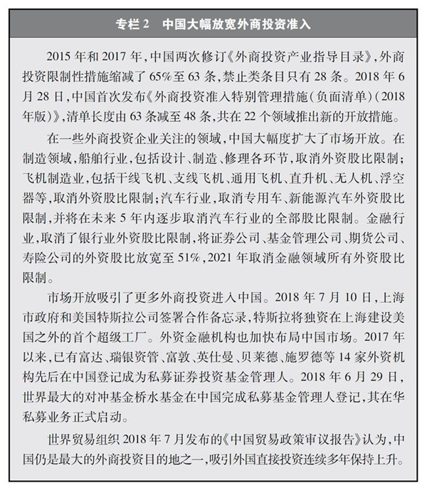 除此之外,中國在某些領(lǐng)域的股權(quán)合作符合中國的國際義務(wù)、各國慣例和實踐,不能被混淆為“強制技術(shù)轉(zhuǎn)讓”。而且,近幾年中國對外商投資的股權(quán)限制不斷放開,外國企業(yè)自由選擇權(quán)不斷擴大(專欄2)。在此過程中,中外企業(yè)股權(quán)合作仍然不斷深化,完全是雙方基于商業(yè)原因的自由選擇。