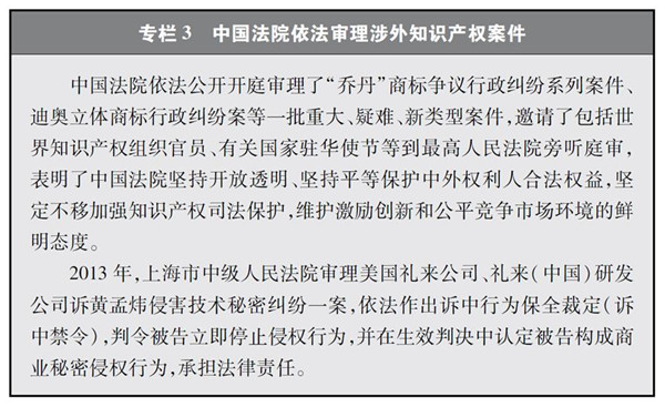 加強知識產(chǎn)權(quán)司法保護,充分發(fā)揮司法保護主導作用。2014年,中國在北京、上海、廣州設(shè)立了專門的知識產(chǎn)權(quán)法院,跨區(qū)域管轄專利等知識產(chǎn)權(quán)案件。自2009年以來,中國共設(shè)立了天津、南京、蘇州、武漢、西安等16個知識產(chǎn)權(quán)法庭,有效提升了知識產(chǎn)權(quán)專業(yè)化審判水平。2013年至2017年,中國法院共新收各類知識產(chǎn)權(quán)案件813564件,審結(jié)781257件。2017年,中國法院共新收一審知識產(chǎn)權(quán)案件213480件,結(jié)案202970件,分別比上年增加46%和43%。中國已經(jīng)成為世界上審理知識產(chǎn)權(quán)案件尤其是專利案件最多的國家。中國依法平等保護中外當事人合法權(quán)益。2016年,中國法院共審結(jié)涉外知識產(chǎn)權(quán)民事一審案件1667件,同比上升25.6%(專欄3)。中國處理涉外知識產(chǎn)權(quán)案件的審理周期是全世界最短的之一,北京知識產(chǎn)權(quán)法庭平均為4個月。由于司法程序快捷,目前中國法院已被國際上視為知識產(chǎn)權(quán)訴訟較為可取的訴訟地,北京知識產(chǎn)權(quán)法院受理的案件中有相當一部分雙方當事人都是外國人。
