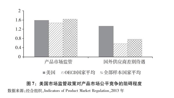美國產(chǎn)品市場的公平競爭環(huán)境不如多數(shù)發(fā)達國家,甚至遜于一些發(fā)展中國家。根據(jù)經(jīng)合組織發(fā)布的2013年“產(chǎn)品市場監(jiān)管指標”對35個經(jīng)合組織國家進行排名,前3位是荷蘭、英國和澳大利亞。美國只排在第27位,反映出美國市場監(jiān)管政策對產(chǎn)品市場公平競爭存在較多障礙。而在加入12個非經(jīng)合組織國家的指標后,美國在47個國家中僅列第30位,其產(chǎn)品市場公平競爭環(huán)境不及立陶宛、保加利亞和馬耳他等非經(jīng)合組織國家。