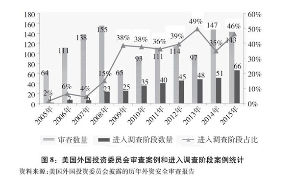 在外商投資安全審查實踐中,美國“國家安全審查”的依據(jù)模糊不清,審查力度不斷加大。根據(jù)美國外國投資委員會的歷年外資安全審查報告,2005-2008年審查外國投資交易案例468起,其中需要進入調(diào)查階段的案例37起,占比僅8%。但自2008年美國財政部發(fā)布《外國人合并、收購和接管規(guī)制:最終規(guī)則》以后,2009-2015年期間審查的770起案例中,需要進入調(diào)查階段的達到310起,占比陡然提高到40%。尤其是在最新披露的2015年數(shù)據(jù)中,這一比例進一步提高到46%,處于較高水平(圖8)。