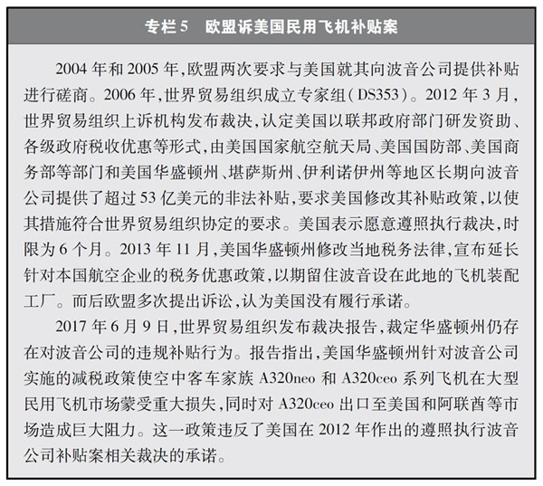 在航空領(lǐng)域,美國波音公司2000年以來獲得聯(lián)邦和州(地方)政府的定向補貼金額145億美元;2011年以來獲得來自各級政府的貸款、債券融資、風險投資、貸款擔保、救助等737億美元(專欄5)。