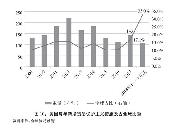 美國貿(mào)易保護主義措施增多,在全球占比不斷提高。全球貿(mào)易預警(Global Trade Alert)統(tǒng)計數(shù)據(jù)顯示,2017年,全球共有837項新的保護主義干預措施,其中美國出臺143項措施,占全球總數(shù)的17.1%。2018年1-7月底,美國出臺的保護主義措施占全球比重達到33%(圖10)。