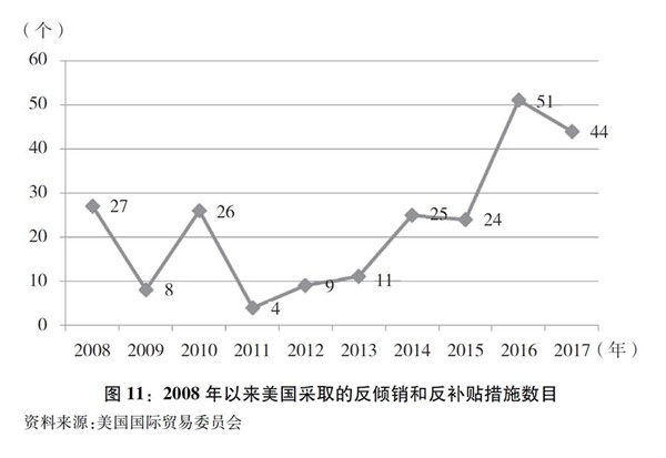 美國國際貿(mào)易委員會的統(tǒng)計數(shù)據(jù)顯示,截至2018年7月17日,美國仍在生效的反傾銷和反補貼措施共有44項(圖11),其中58%是2008年金融危機以來新采取的“雙反”措施,主要針對中國、歐盟和日本。
