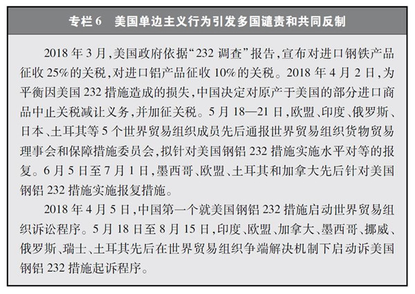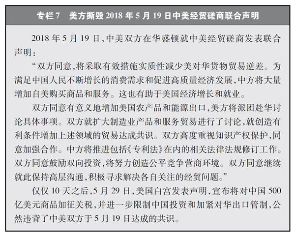 美國政府在雙邊經(jīng)貿(mào)談判中出爾反爾,不守承諾。中國歷來高度重視維護中美關(guān)系穩(wěn)定,特別是2017年以來,積極回應(yīng)美國經(jīng)貿(mào)關(guān)切,以極大的誠意和耐心與美國政府開展了多輪磋商,力圖彌合分歧、解決問題。2018年2月下旬到3月上旬,應(yīng)美國方面強烈要求,中國派團赴美舉行經(jīng)貿(mào)談判。4月3日,美國公布對500億美元中國輸美產(chǎn)品加征25%關(guān)稅的產(chǎn)品清單。面對美國反復無常、不斷抬高要價的行為,中國本著最大限度通過對話解決問題的誠意,于5月初與來華談判的美國代表進行了認真磋商。5月15日至19日,中國應(yīng)美國要求再次派代表團赴美談判,并在談判中對美國訴求做了積極回應(yīng)。雙方在付出艱辛努力后,達成“雙方不打貿(mào)易戰(zhàn)”的共識,并于5月19日對外發(fā)表了聯(lián)合聲明。但是,僅僅10天之后,美國政府就公然撕毀雙方剛剛達成的聯(lián)合聲明,背棄不打貿(mào)易戰(zhàn)的承諾,越過世界貿(mào)易組織爭端解決機制,宣布將對來自中國的產(chǎn)品實施大規(guī)模征稅措施,單方面挑起貿(mào)易戰(zhàn)(專欄7)。