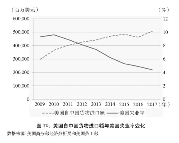 美國將國內(nèi)政策失誤和制度缺陷導致的失業(yè)問題錯誤歸因于國際貿(mào)易。美國政府認為他國通過不公平貿(mào)易的方式搶奪了本國就業(yè)崗位,作為美國貿(mào)易逆差最大來源國,中國首當其沖成為主要的被指責對象。事實是,根據(jù)聯(lián)合國數(shù)據(jù),2001-2017年,中美貿(mào)易額增長了4.4倍,但美國失業(yè)率則從5.7%下降到4.1%。尤其是2009年以來,美國從中國進口快速增長,同期美國失業(yè)率反而呈現(xiàn)出持續(xù)下降的態(tài)勢,美國政府指責的貨物進口和失業(yè)率之間的替代關(guān)系并不存在(圖12)。2017年美國國會研究中心報告顯示,2010-2015年,盡管美國制造業(yè)從中國進口整體增加32.4%,美國制造業(yè)的工作機會反而增加了6.8%。