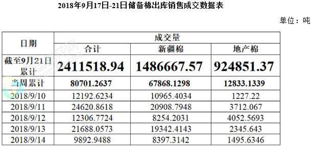 截至9月21日(上周五),2017/2018年度儲備棉輪出累計(jì)掛牌411.6萬噸,其中新疆棉158.4萬噸、地產(chǎn)棉253.2萬噸;累計(jì)成交241.2萬噸,成交率59%,其中新疆棉成交148.7萬噸,成交率94%,地產(chǎn)棉成交92.5萬噸,成交率37%;累計(jì)成交企業(yè)831家,其中紡織企業(yè)663家,成交180萬噸;貿(mào)易商168家,成交61萬噸。
