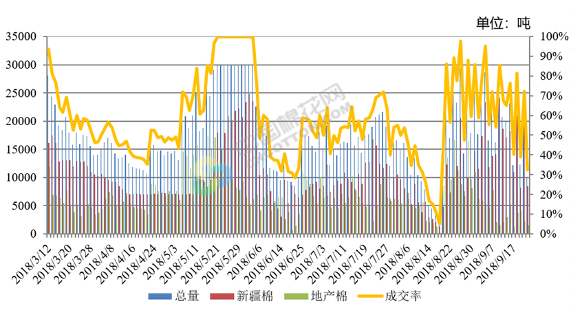 上周(2018年9月17-21日),2017/2018年度儲備棉輪出第二十八周,中國儲備棉管理有限公司上市交易儲備棉15.3萬噸,其中新疆棉9.7萬噸,地產(chǎn)棉5.6萬噸;實(shí)際成交8.1萬噸,成交率53%,新疆棉成交6.8萬噸,成交率68%,地產(chǎn)棉成交1.3萬噸,成交率39%。