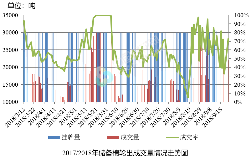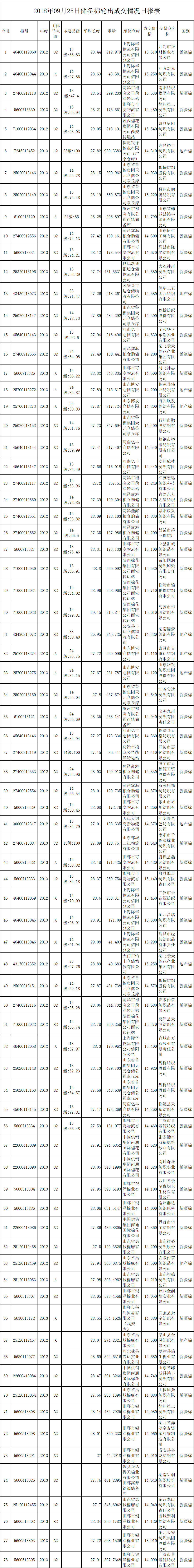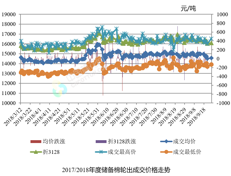 9月25日儲備棉輪出銷售資源30035.8935噸,實際成交21945.0699噸,成交率73.06%。平均成交價格14561元/噸(較前一日上漲50元/噸);折3128價格16092元/噸(較前一日上漲42元/噸)。