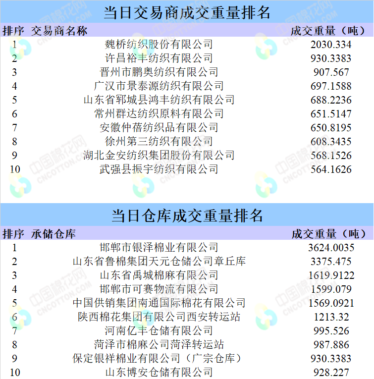 當(dāng)日情況:地產(chǎn)棉成交3051.8889噸,成交率68%,成交均價14334元/噸,平均加價535元/噸,最高成交價15250元/噸,最低成交價14110元/噸。新疆棉成交18893.181噸,成交率74%,成交均價14597元/噸,平均加價373元/噸,最高成交價16530元/噸,最低成交價13910元/噸。