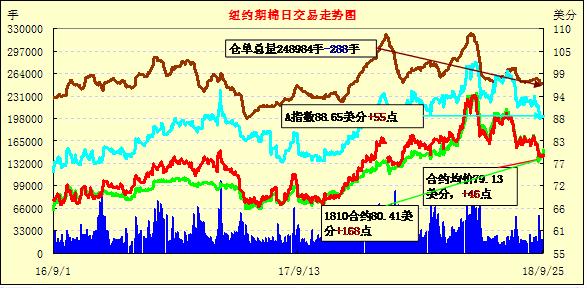 9月25日紐約期棉市場(chǎng)全面收漲。1812合約結(jié)算價(jià)78.99美分,漲41點(diǎn);1903合約結(jié)算價(jià)79.44美分,漲48點(diǎn);1905合約結(jié)算價(jià)80.09美分,漲50點(diǎn)。其他合約上漲41-51點(diǎn)不等。當(dāng)日12月合約平穩(wěn)開(kāi)盤(pán),開(kāi)盤(pán)后交易重心呈震蕩運(yùn)行態(tài)勢(shì),后買盤(pán)入場(chǎng),市場(chǎng)受支撐走高,雖盤(pán)中有所回落,但在買盤(pán)支撐下,最終扭轉(zhuǎn)前一日跌勢(shì),以漲勢(shì)收盤(pán)。據(jù)北卡棉農(nóng)反饋,受颶風(fēng)帶來(lái)的大風(fēng)、強(qiáng)降雨和洪水影響,北卡中部和中南部棉區(qū)棉花受損量可能達(dá)30%。由于季風(fēng)降雨量偏少,印度棉株生長(zhǎng)狀況可能受到一定影響。但由于中國(guó)對(duì)印度棉需求量可能出現(xiàn)較大增幅,對(duì)棉價(jià)形成支撐。外圍美元指數(shù)下跌,小麥期貨下跌,大豆和玉米期貨上漲。美股收盤(pán)漲跌不一,道指和標(biāo)普再度收跌,納指維持漲勢(shì)。