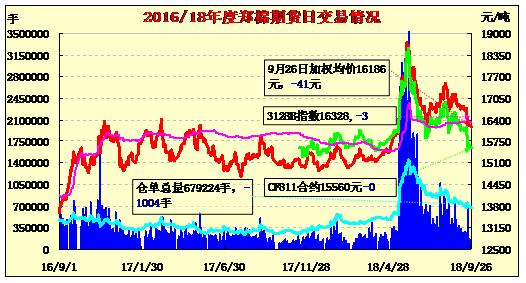 9月26日隔夜鄭棉沖高盤整,今日在空頭賣盤壓制下回落,午后創(chuàng)日低,尾盤在空頭回補(bǔ)推動(dòng)下反彈,日線形成星線。日內(nèi)成交量放大,持倉(cāng)量略有增加。基本面情況:2018年8月中國(guó)棉紡織景氣指數(shù)48.94,與7月相比上升1.17,符合預(yù)期。8月,儲(chǔ)備棉投放延期9月底政策落定,滌綸短纖價(jià)格快速上漲,紡企原料庫(kù)存有所下降。8月是紡織行業(yè)由淡季步入旺季的過渡期,企業(yè)生產(chǎn)有所恢復(fù),市場(chǎng)交投氣氛逐步好轉(zhuǎn),紗線價(jià)格小幅上漲,坯布價(jià)格持穩(wěn)為主。目前中美雙方互加關(guān)稅措施已陸續(xù)落地,但中美貿(mào)易摩擦走向仍未明朗,部分紡企表示對(duì)未來市場(chǎng)仍有信心。隨著“金九銀十”的到來,市場(chǎng)低迷現(xiàn)象逐步改善,預(yù)計(jì)9月棉紡織景氣指數(shù)上升。