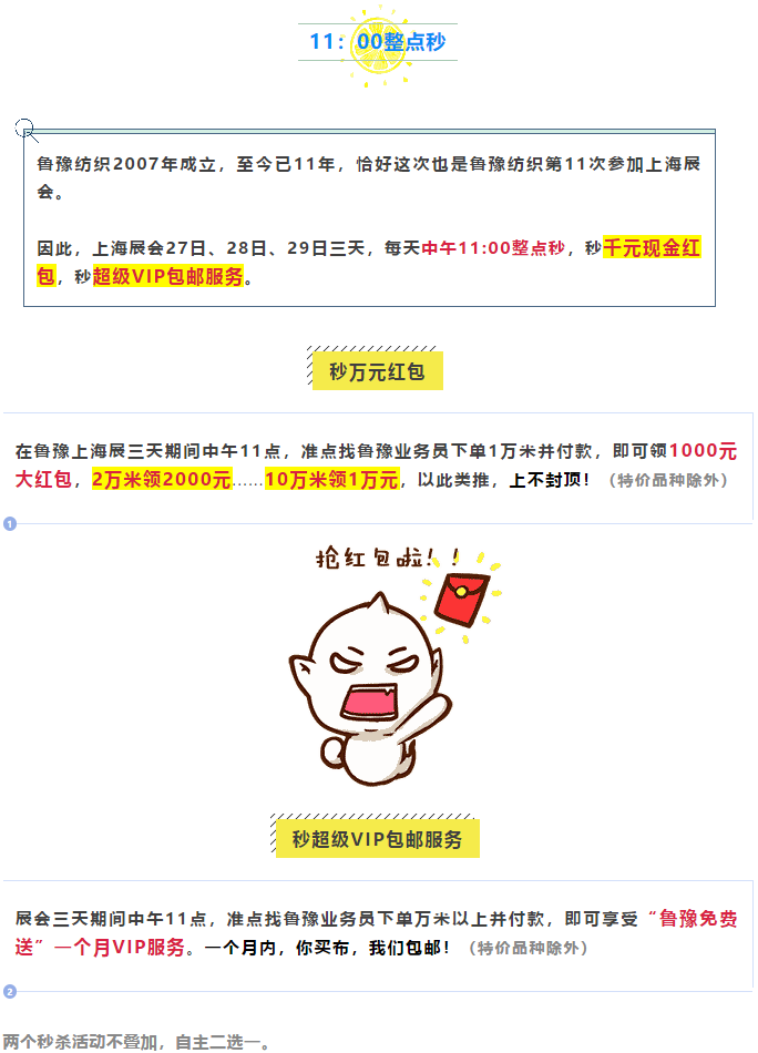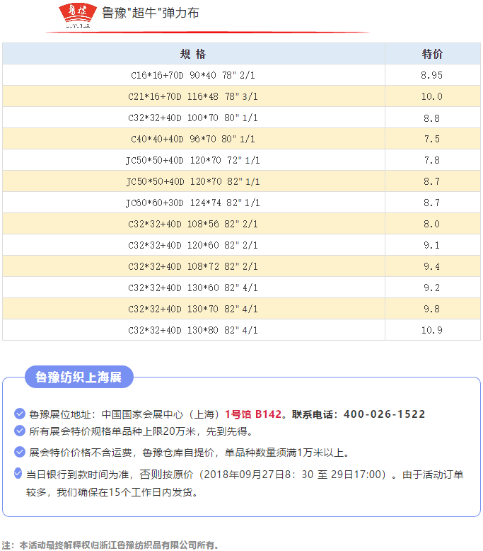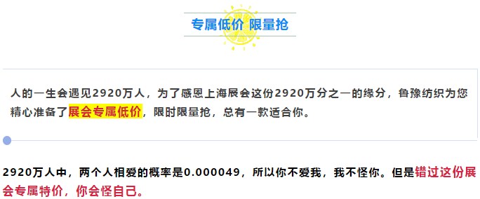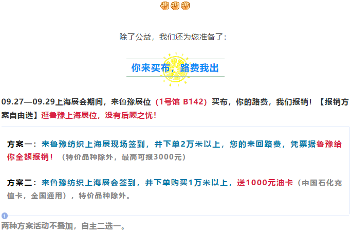 今天是上海Intertextile秋冬面輔料展第一天,魯豫紡織有幸參展,并鄭重決定:上海展會期間,只要您來魯豫展位每買1米布,我們便將捐贈1分錢用于慈善事業(yè)。