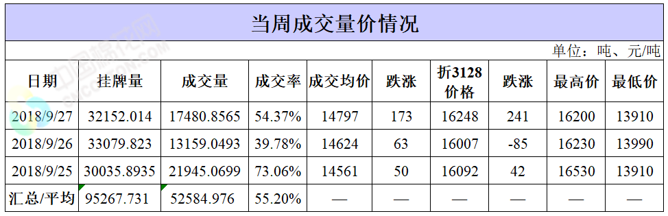 累計(jì)情況:截至9月27日,累計(jì)計(jì)劃出庫(kù)421.1萬噸,累計(jì)出庫(kù)成交246.4萬噸,成交率為59%;成交最高價(jià)17700元/噸,最低價(jià)12700元/噸。