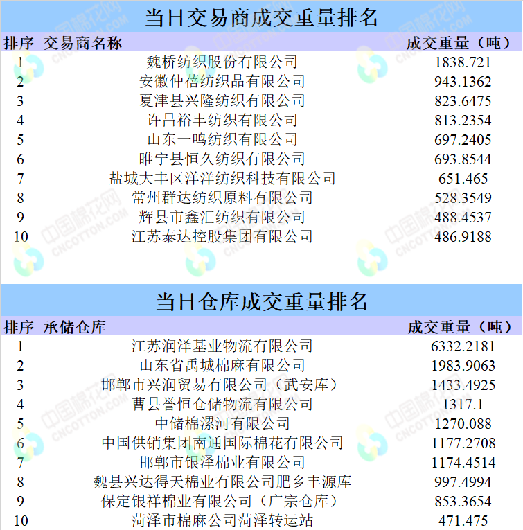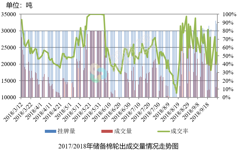 9月27日儲(chǔ)備棉輪出銷售資源32152.014噸,實(shí)際成交17480.8565噸,成交率54.37%。平均成交價(jià)格14797元/噸(較前一日上漲173元/噸);折3128價(jià)格16248元/噸(較前一日上漲241元/噸)。
