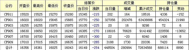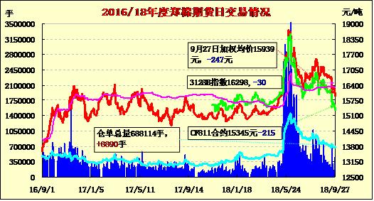 9月27日隔夜鄭棉下滑,今日盤中低位震蕩,收盤于日低一線,日線形成長陰線。日內(nèi)成交量放大,持倉量增加?;久媲闆r:國務(wù)院會議決定,適應(yīng)產(chǎn)業(yè)升級、降低企業(yè)成本和群眾多層次消費(fèi)等需求,從今年11月1日起,降低1585個稅目工業(yè)品等商品進(jìn)口關(guān)稅稅率,將部分國內(nèi)市場需求大的工程機(jī)械、儀器儀表等機(jī)電設(shè)備平均稅率由12.2%降至8.8%,紡織品、建材等商品平均稅率由11.5%降至8.4%,紙制品等部分資源性商品及初級加工品平均稅率由6.6%降至5.4%,并對同類或相似商品減并稅級。