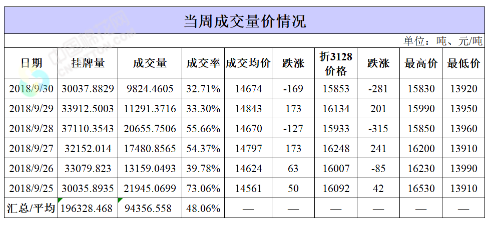累計(jì)情況:截至9月30日,累計(jì)計(jì)劃出庫431萬噸,累計(jì)出庫成交250.6萬噸,成交率為58%;成交最高價(jià)17700元/噸,最低價(jià)12700元/噸。
