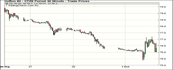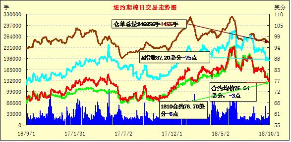 10月1日紐約期棉近跌遠(yuǎn)漲。1810合約結(jié)算價76.70美分/磅,跌6點(diǎn);主力1812合約結(jié)算價76.31美分/磅,跌6點(diǎn)。1903合約結(jié)算價77.05美分/磅,跌24點(diǎn);其他合約漲跌點(diǎn)不等。當(dāng)日12月合約小幅低開,開盤后呈窄幅震蕩態(tài)勢,后賣盤入場,市場承壓走低,低點(diǎn)處買盤發(fā)力,交易重心受支撐走高,受獲利了結(jié)盤壓力市場承壓回落,最終未能挽回近日下跌局面,以微幅下跌收盤。紐約期棉大幅波動,早盤在后續(xù)跟進(jìn)賣盤打壓下繼續(xù)向下突破,隨后美加自貿(mào)協(xié)定消息帶動棉價大幅反彈,但很快又在中美貿(mào)易戰(zhàn)和美棉豐收的壓力下再度下跌,最終盤面微幅收低。關(guān)注美棉苗情及下周USDA月報對美棉產(chǎn)量調(diào)整。外圍美元指數(shù)上漲,玉米、大豆、小麥期貨上漲。