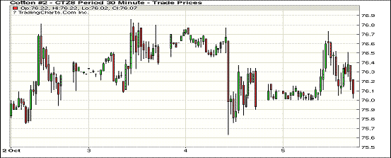 10月5日紐約期棉市場全面收漲。1812合約結(jié)算價76.10美分,漲10點;1903合約結(jié)算價77.14美分,漲32點;1905合約結(jié)算價77.95美分,漲26點。其他合約上漲21-27點不等。當日12月合約平穩(wěn)開盤,開盤后維持在76.00-76.20美分區(qū)間窄幅震蕩運行,后買盤發(fā)力,市場受支撐走高,至當日高點76.73美分處賣盤入場,交易重心承壓走低,后至收盤處雖經(jīng)歷震蕩,市場至較高點有所回落,但仍以漲勢收盤。目前市場多持觀望態(tài)度。下周美國農(nóng)業(yè)部將發(fā)布10月份最新供需預測,或?qū)⒔o市場提供參考方向。外圍美元指數(shù)下跌,玉米、大豆和小麥期貨上漲。