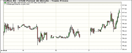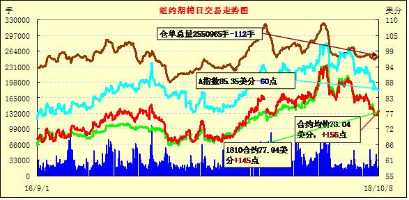 8日紐約期棉市場(chǎng)漲勢(shì)延續(xù)。1812合約結(jié)算價(jià)77.55美分,漲145點(diǎn);1903合約結(jié)算價(jià)78.49美分,漲135點(diǎn);1905合約結(jié)算價(jià)79.21美分,漲126點(diǎn)。其他合約上漲46-113點(diǎn)不等。當(dāng)日12月合約小幅高開,開盤后交易重心受支撐小幅上行,后買盤發(fā)力,市場(chǎng)繼續(xù)走高,高點(diǎn)處賣盤入場(chǎng),交易重心承壓下行,低點(diǎn)處買盤入場(chǎng),市場(chǎng)受支撐止跌反彈,最終得以延續(xù)前一日漲勢(shì)。颶風(fēng)Michael預(yù)計(jì)將于周三夜間或周四早間于喬治亞州登陸,強(qiáng)度可能為3級(jí)。有分析人士稱,颶風(fēng)或?qū)⒃斐?0.9-16.3萬噸的損失。因哥倫布日假期,8號(hào)紐約期市休市一天。外圍美元指數(shù)上漲,玉米、大豆和小麥期貨下跌。周一美股收盤漲跌不一,道指收漲,標(biāo)普和納指收跌。