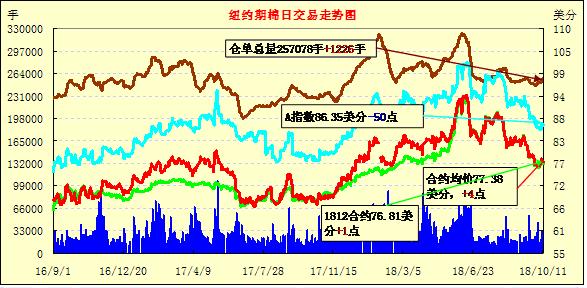 11日紐約期棉市場全面收漲。1812合約結(jié)算價76.81美分,漲1點;1903合約結(jié)算價78.17美分,漲13點;1905合約結(jié)算價79.03美分,漲17點。其他合約上漲14-47點不等。當(dāng)日12月合約小幅高開,開盤后交易重心維持上行態(tài)勢,后賣盤入場,市場承壓走低,低點處買盤發(fā)力,交易重心受支撐有所回彈,但由于上漲動力不足,市場再度回落,后至收盤處維持震蕩態(tài)勢,最終以微幅上漲收盤。北京時間凌晨美國農(nóng)業(yè)部(USDA)發(fā)布10月份最新供需平衡表,雖然美國本年度總產(chǎn)意外調(diào)增,但對印度歷史數(shù)據(jù)進行了較大幅度修正,期末庫存隨之出現(xiàn)較大幅度調(diào)減,對期棉價格形成一定支撐。加之颶風(fēng)Michael已強勢登陸,市場也普遍擔(dān)憂由此帶來的惡劣天氣將對東南棉區(qū)的棉花產(chǎn)量和質(zhì)量造成不利影響。外圍美元指數(shù)下跌,小麥期貨下跌,玉米和大豆期貨上漲。周三美股三大股指全線下挫,均出現(xiàn)較大跌幅。